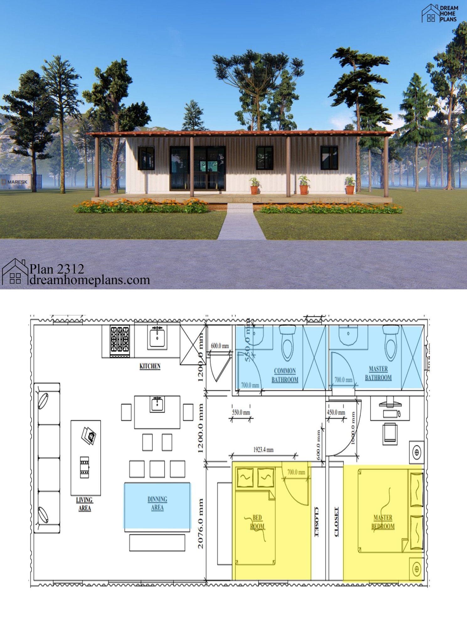 This one-story house has a total area of 603 square feet and is designed for a small family or a couple. The house features two bedrooms and two bathroom, with an open-concept living room, dining area, and kitchen. The bedrooms are likely to be located on opposite sides of the house, with the bathroom centrally located for easy access.